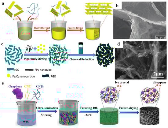 (a) The fabrication process of aPANF/GA. (b) The microstructure of aPANF/GA. Reproduced with permission from [83]. (c) Schematic fabrication process of GPFA. (d) The SEM images of GPFA. Reproduced with permission from [84]. (e) Schematic illustration of the fabrication of the CNTs/graphene/WPU/CNC composite aerogels. Reproduced with permission from [85].