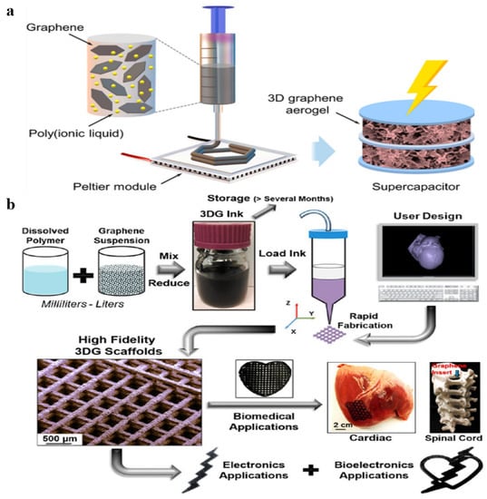 - Jakus, A.E.; Secor, E.B.; Rutz, A.L.; Jordan, S.W.; Hersam, M.C.; Shah, R.N. Three-Dimensional Printing of High-Content Graphene Scaffolds for Electronic and Biomedical Applications. ACS Nano 2015, 9, 4636–4648. [Google Scholar] [CrossRef]