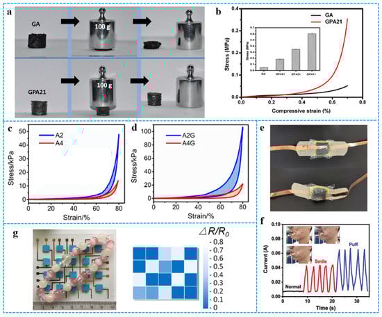 (a) Digital images showing compressibility of pure GA and GPA21. (b) The compressive stress-strain curves of GA and GPA21 at the maximum strain of 70%, inset is the average compressive strength of GA and GPAs. Reproduced with permission from [24]. (c,d) Stress-strain curves of compression-decompression tests on A2/A4 and A2G/A4G. Reproduced with permission from [99]. (e) Digital photo of the assembled CNF/CNT/RGO carbon aerogels sensor. (f) Current signals from facial expressions (normal, smile, and puff). Reproduced with permission from [106]. (g) Bracelets on flat PDMS/graphene aerogel sensor arrays and the signal output. Reproduced with permission from [99].