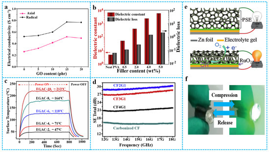 Due to the addition of graphene-based materials, the electrical properties of polymer-based aerogels have been greatly improved [107,108]. The conductive path of structure and composite uniformity of graphene-based materials/polymer composite aerogels determine the conductivity of the material. For example, Jiang et al. [109] reported graphene/PI composite aerogels containing different contents of GO. As shown in Figure 12a, the electrical conductivity of graphene/PI composite aerogels was gradually enhanced while the original GO content increased. This occurred because RGO had good conductivity, forming effective conductive paths in the material. Wang et al. [110] prepared graphene/PVA composite aerogels with excellent dielectric properties by a two-step method. Figure 12b shows the dielectric constant and dielectric loss of graphene/PVA composite aerogels with different graphene contents. The highest dielectric constant achieved was 5720 at a graphene content of 5 wt%, equivalent to almost 1150 times that of the neat PVA. The high dielectric constants may be due to the full exfoliation and dispersion of RGO sheets in the polymer matrix. However, the enhanced dielectric constants were always at the expense of similar increases in loss, which was attributed to the motion of free charge carriers resulting from the formation of continuous conductive networks. Due to excellent electrical conductivity and thermal conductivity, graphene aerogel can be composited into the polymer matrix as a functional filler, thereby achieving application value in electrothermal field [111]. Yang et al. [112] reported graphene aerogel/epoxy resin nanocomposites (EGAC) with excellent electrothermal properties. Figure 12c shows that the steady-state surface temperature of EGAC increased as the density of the graphene aerogel increased. The improved Joule heating performances of the aerogel composites are attributed to the 3D morphology and original structural properties of graphene scaffolds. The electromagnetic shielding performance of the composite material depends on electrical performance and magnetic performance. However, the spatial distribution of graphene aerogels plays an important role in the mechanical and electromagnetic shielding properties of polymer composites. As seen from Figure 12d, cellulose fiber/RGO (CF/RGO) aerogels are closely related to the loading of RGO at a fixed frequency. For example, at 18 GHz, the shielding effectiveness (SE) total of the composite aerogel of that weight ratio of CF and GO was 2:1, and when treated at 600 °C under argon (CF2G1-600A), is almost twice as much as the pure cellulose fiber aerogel [25]. The improved electromagnetic interference (EMI) SE was mainly ascribed to increased RGO loading and enhanced electrical conductivity, which had a substantial connection with EMI shielding performance [113]. A higher RGO loading leads to stronger interaction with the incident electromagnetic waves, achieving improved SE [114]. In addition, Wang et al. [26] reported graphene/polyurethane composite aerogels for applications in new energy management devices, such as tactile sensing batteries, that can perform environmental pressure sensing (Figure 12e,f).