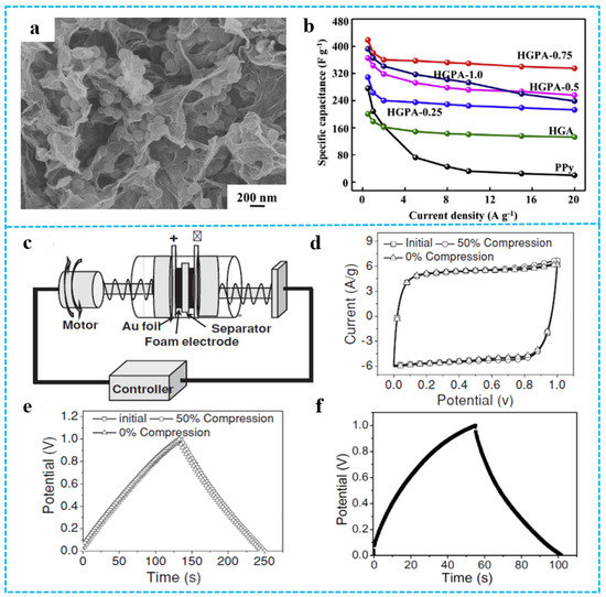 The conductivity of graphene can reach (6000 S/cm), which makes it possible to prepare composite materials with excellent electrochemical properties. However, the serious restacking of the 2D graphene layer during the manufacturing process leads to lower conductivity. The 3D graphene-based materials aerogel with interconnected network and abundant porous structure can effectively prevent the accumulation of 2D graphene layers, showing good and stable electrochemical performance. For conductive polymers such as polyaniline [115,116], PPy [117,118,119], and polythiophene [120], they can play a synergistic role with graphene aerogels and greatly improve the electrochemical properties of composite aerogels due to their good electrical conductivity, easy synthesis, high redox pseudocapacitive charge storage, etc. He et al. [121] fabricated holey graphene/PPy composite aerogels (HGPAs) with 3D hierarchical structure by using freeze-drying technology. Figure 13a shows that PPy nanoparticles embedded between the holey graphene (HG) nanosheets further limit the restacking of HG nanosheets. The pore structure of composite aerogels was important to shorten the ion pathway and enhance ion kinetics. HGPA-0.75 composite aerogel electrode showed high specific capacitance (418 F g−1) at a current density of 0.5 A g−1 (Figure 13b). The size and composite ratio of conductive polymer influences electrochemical performance. For example, the composite aerogel electrode with the larger PPy nanoparticles have more excellent capacitance performance [121]. Graphene-based materials/polymer composite aerogels with excellent electrochemical properties can be used as electrode materials for supercapacitors [122]. As an example, Zhao et al. [41] used PPy as a mediator and developed a unique strategy for in situ formation of PPy-graphene (PPy-G) foam. Figure 13c demonstrated a highly compression-tolerant graphene-based supercapacitor. As shown in Figure 13d, owing to the conductivity and excellent mechanical strength of PPy-G foam electrodes, the cyclic voltammetry (CV) curves of the assembled capacitor retained a rectangular shape with ideal capacitive behavior. No obvious change was observed in the CVs of the compressed supercapacitors with a 50% applied strain. The constant current charge-discharge curves of PPy-G foam electrode and graphene aerogel electrode supercapacitors at 1.5 A/g current are shown in Figure 13e,f. The specific capacitance calculated from the discharge slopes was ca. 350 F/g, which was much higher than that of both compact PPy film (ca. 50 F/g) and pure 3D graphene (ca.151 F/g). This enhanced the capacitance of PPy-G because of the synergetic function of PPy and graphene aerogel.