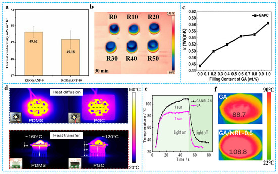 (a) Thermal conductivity of RGO@ANF-0 and RGO@ANF-40. (b) Thermal infrared images of all aerogels with the temperature of the warm table at 250 °C, R0 to R50 represent RGO@ANF-0 to RGO@ANF-50 respectively. Reproduced with permission from [123]. (c) The thermal conductivities of GAPC with different GA contents. Reproduced with permission from [124]. (d) Infrared images of an LED lamp with PDMS and a PGC for heat dissipation and infrared images of a LED lamp with PDMS and a PGC for heat transfer. Reproduced with permission from [126]. (e) Temperature changing curves of “light on” and “light off” under 1 sun. (f) Solar-thermal behavior of GA/ NRL-0.5 and GA under 1 sun. Reproduced with permission from [23].