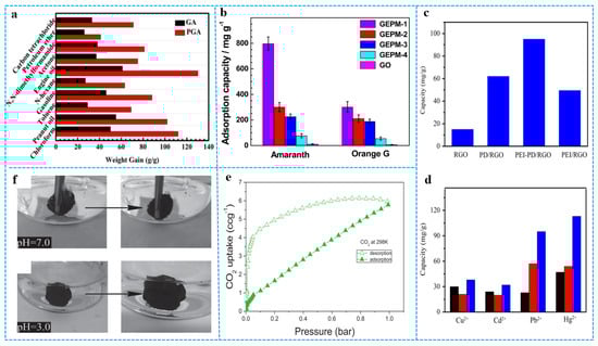 (a) Absorption capacities of GA and PGA for various oil and organic solvents. Reproduced with permission from [133]. (b) Adsorption capacities of GEPMs for amaranth and orange G by GO-PEI porous material (GEPM) and GO. Reproduced with permission from [134]. (c) Adsorption capacity of Pb2+ on RGO, PD/RGO, PEI-PD/RGO, and PEI/RGO aerogels. (d) Comparison of adsorption capacity of Cu2+, Cd2+, Pb2+, and Hg2+ on active carbon (black), PEI/RGO (red), PE1-PD/RGO (blue) aerogels. Reproduced with permission from [135]. (e) CO2 adsorption and desorption of chitosan-grafted GO aerogel at 298 K. Reproduced with permission from [136]. (f) The adsorption of chloroform by the ss-GF in water of pH 7.0 and the desorption of chloroform by the ss-GF in water of pH 3.0. Reproduced with permission from [137].