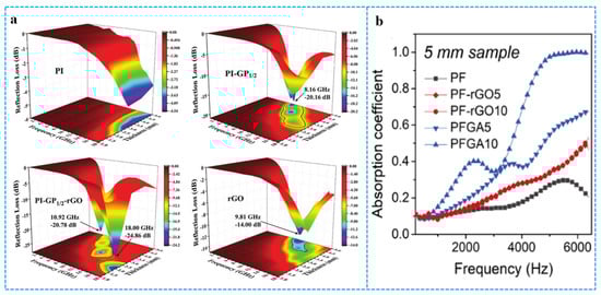 (a) 3D reflection loss maps of PI, PI-GP1/2, PI-GP1/2-rGO and RGO composite foams. Reproduced with permission from [138]. (b) The sound-absorption coefficients of PF, PF-RGO and PFGA at 5 mm thickness. Reproduced with permission from [57].
