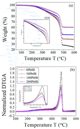 The TGA and DTGA curves of the EPDM host sample and samples loaded with 50, 100, and 200 phr lead are presented in Figure 1. The composite samples underwent two main decomposition stages.