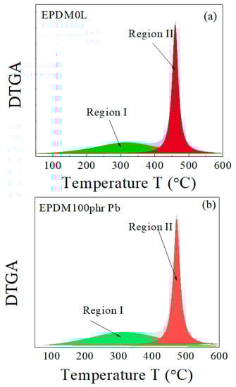 Peak separation of the DTGA curves for EPDM host samples (a) without lead and (b) with 100 phr lead.