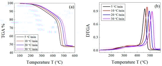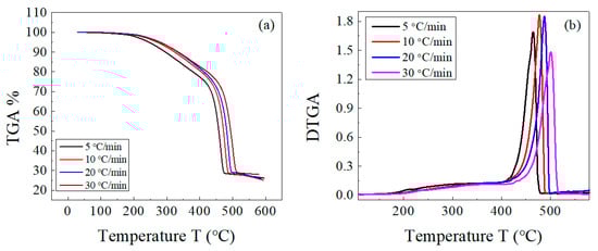 Thermogravimetric analysis (TGA) was performed using a TA Instruments Q50 thermogravimetric analyzer, under a nitrogen (N2) flow of 20 mL/min. The measurements were carried out at different heating rates (5, 10, 20, and 30 °C/min) with constant mass of about 10 mg.