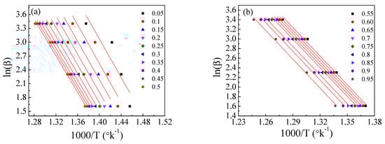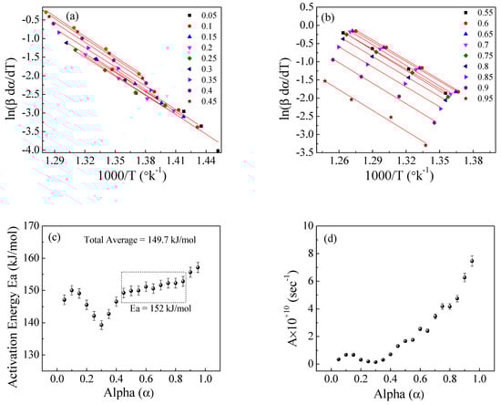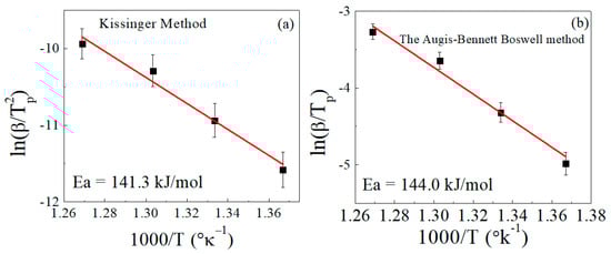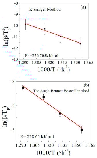 Figure 5 shows the relationship between ln(β/Tp2) and 1000/T, as well as that between ln(β/Tp) and 1000/T, according to the Kissinger [] and Augis–Bennett/Boswell methods [,], respectively, for determination of the activation energy. Both methods gave approximately equal results within the permissible error. The activation energy value calculated using the Kissinger method was about 227 kJ/mol, while the Augis–Bennett/Boswell method gave a value of about 229 kJ/mol. The error was less than 1% between the two methods. These results are largely consistent with the references [,].