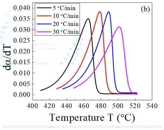 Figure 7 illustrates the dependence of the conversion α (Figure 7a) and its first derivative (Figure 7b) on the temperature. Using these results, the main decomposition stage of the host EPDM with and without lead was analyzed, and a comparison among the three methods was carried out.