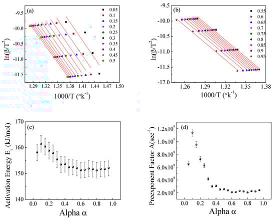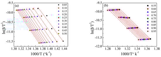 Using the KAS method and according to (6), the relationship between ln[β/T2] and 1/T was plotted for each value of conversion α. From the slope and the intersection, Ea and A can be calculated.