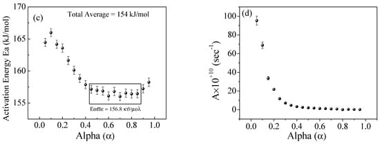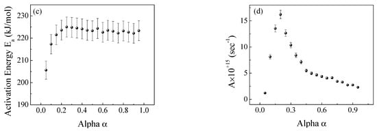 Figure 8, Figure 9 and Figure 10 illustrate the application of the KAS, FWO, and Friedman methods, respectively, for EPDM host composite. A resemblance was noted in the behavior of the activation energy and coefficient A for both the KAS (Figure 8c,d) and FWO (Figure 9c,d) methods. The behavior was different when applying Friedman’s method (Figure 10c,d). This may be attributed to the dependence of Friedman’s method (8) on the first derivative with respect to time of the degree of conversion (dα/dt). Despite this apparent difference in behavior, there are some common points that could be concluded. The total average values of activation energy for the three methods are distinctly close (229, 229.6, and 231 kJ/mole for the KAS, FWO, and Friedman methods, respectively). Additionally, the pre-exponential factors for the three methods are of the same order of magnitude (10+15) (see Figure 8, Figure 9 and Figure 10d).