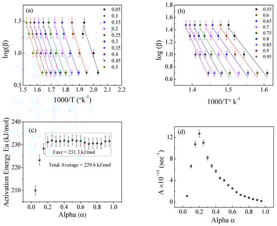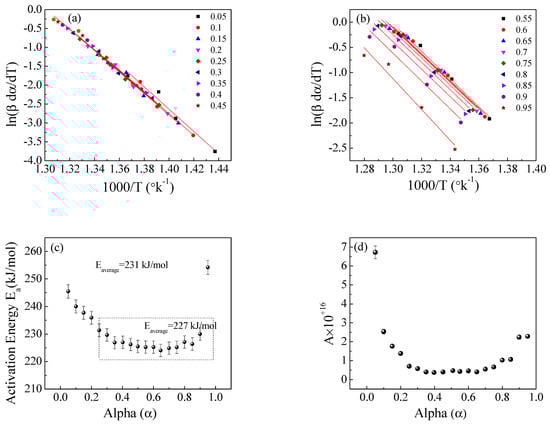 The Kissinger–Akahira–Sunose method for the EPDM host composite: (a,b) ln(β/T2) versus temperature; (c,d) the dependence of Ea and A, respectively, on conversion α.
