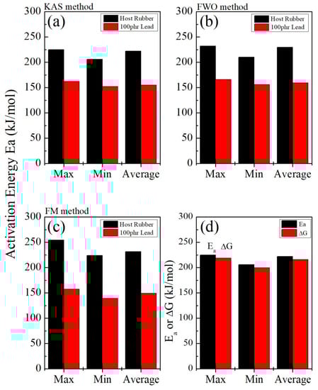 A comparison among the activation energy values of the host and lead-loaded EPDM rubber samples using the three methods (a) KAS, (b) FWO, and (c) FM, and (d) a comparison between the values of the activation energy, Ea, and the change in the Gibbs free energy, ΔG (for KAS, using the host rubber sample as an example).