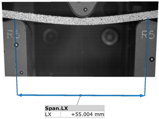 The hardness of the composites was measured by the Shore D method on a Zwick 7206/H04 hardness tester (Ulm, Germany). The readings were taken after 15 s at a temperature of 23 °C []. Bending strength was measured using a Zwick 2.5 kN static machine. Pairs of images to calculate major and minor strain directions were recorded by an ARAMIS SRX, Zeiss (Jena, Germany) DIC system. The cross-sectional area of the sample along with the support span and force information was used to determine the bending strength according to Formula (1):