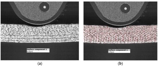 The tests were carried out at a constant speed of 3 mm/min. Figure 4 shows the map of the principal deformation directions of the major strains (Eps1) and minor strains (Eps2) on the sample during bending. The Eps1 directions visualize where the material carries the largest strains and in which directions. It can be seen that the lower layers of the sample carry the strains horizontally in the X direction determined in the analyses. These layers are stretched. Similarly (Figure 4b) shows which layers are compressed. As in any pure bending test, there is a so-called neutral layer in the center of the cross-section that does not carry any strains.