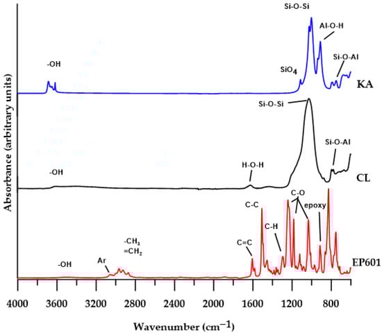 ATR/FTIR spectra of pure EP601 and fillers: CL and KA.