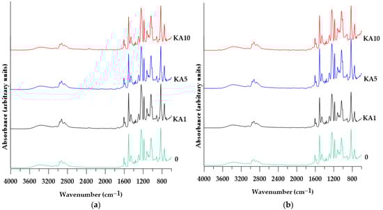 The ATR/FTIR spectra of KA show characteristic absorption bands associated with vibrations: 3616–3686 cm−1—vibrations of OH groups in the crystal structure, 1114 cm−1—stretching vibrations of the tetragonal structure of SiO4; 1026 and 1003 cm−1—stretching vibrations of Si-O-Si; 911 cm−1—Al-O-H bending vibrations of the Al2OH group; 788, 750 and 676 cm−1—stretching vibrations of Si-O, Si-O-Al as well as Al-O-H [].