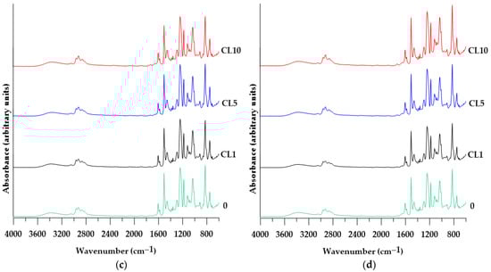 ATR/FTIR spectra of the materials obtained (a) KA before DMA analysis; (b) KA after DMA analysis; (c) CL before DMA analysis; (d) CL after DMA analysis.