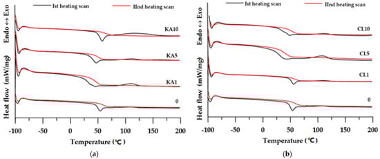 DSC curves of the prepared materials: (a) KA-based composites; (b) CL-based composites.