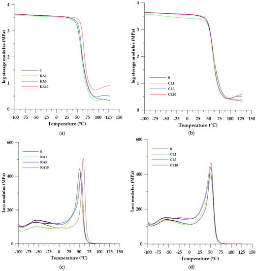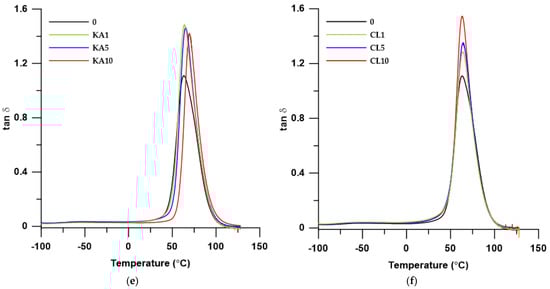 The flexibility of the material is also characterized by the value of the damping factor (tan δmax). The higher its value, the less flexible the material is, which makes it less capable of damping vibrations. Analyzing the effect of the filler addition on this parameter, it can be seen that its addition increased the tan δmax value with respect to the starting material. In the case of this parameter, there are clear differences in the type of filler used. In the series of composites with kaolinite, the tan δmax values decreased as the filler content increased, while in the series with clinoptilolite this relationship was reversed.