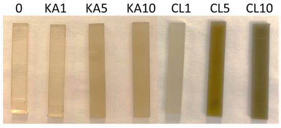 A total of 7 plates with dimensions of approximately 50 mm × 90 mm were designated for bending tests, labeled and sequentially numbered as follows: CL5; KA1; CL10; 0 (reference material); KA5; CL1; KA10.
