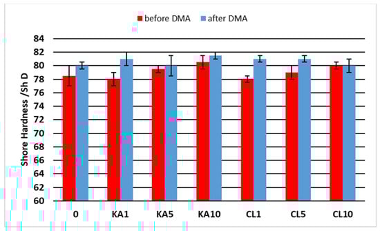 For the obtained materials, the hardness was tested before and after the DMA analysis, and the results are presented in Figure 10.