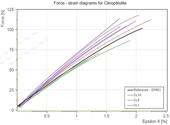 By analyzing the effect of the percentage addition of clinoptilolite on strength properties, it can be unequivocally stated that for the added value of 10% the properties deteriorated. Both the maximum force carried by the sample in the bending test and the maximum tensile strains in the lower layer of the sample are lower than those of the reference material. However, at addition values of 1% and 5% there is a slight improvement in the maximum force value and a slight decrease in the strain values for 1% clinoptilolite, and strain values for 5% clinoptilolite are similar to those in the reference material.