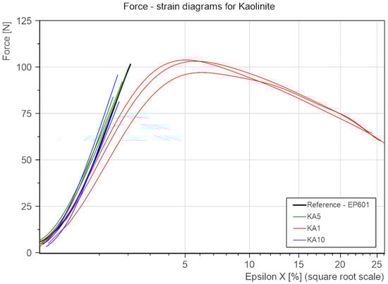 To compare the influence on the strength properties of the percentage of added KA and CL. the results were collated into two groups (Figure 11 and Figure 12). Due to the insignificant difference in the cross-sectional area of all samples (the standard deviation in this range is 0.88 mm2 compared to the mean cross-sectional area of all samples at the level of 35.71 mm2), the analysis of bending force vs. deformation was chosen instead of bending stress vs. deformation.