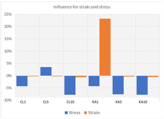 Level 0% in Figure 13 was taken as the reference material value. A positive percentage change indicates an improvement in properties, while a negative change indicates a deterioration in properties.