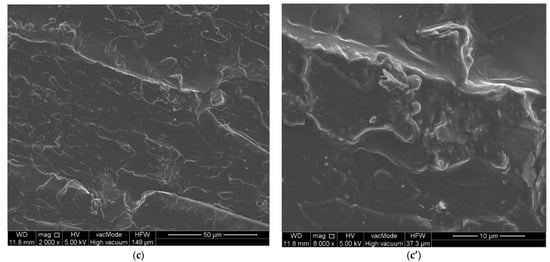 Studies of the microstructure of the composites obtained using scanning electron microscopy (SEM) show the different nature of the two mineral additives. The surfaces of the reference sample are characterized by a homogeneous internal structure (Figure 14a). The addition of both kaolinite and clinoptilolite causes the distinct appearance of thin overlapping layers in the microstructure of the materials tested. The structure of these composites becomes less homogeneous, and pear-shaped aggregates of the applied additives are visible (Figure 14b,c). This is particularly evident in composites whose composition was modified by the addition of kaolinite. Analyzing the surfaces obtained as a result of destructive forces in composites containing in their composition the addition of kaolinite or clinoptilolite, it is clear that the process of destruction took place on the mineral aggregates present in the structure of the tested materials (Figure 14b’,c’).