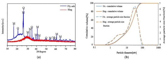 The test uses grade I fly ash and S95 grade blast-furnace slag; specific chemical components were obtained by XRF analysis, as shown in Table 1. The chemical composition of fly ash mainly comprises SiO2 and Al2O3, and the main components of slag are CaO, SiO2, and Al2O3. An X-ray diffraction analysis of the fly ash and slag is shown in Figure 1a, from which it can be seen that the slag is characterized by an amorphous phase; there are two crystalline phases in fly ash, namely mullite and quartz. Figure 1b shows the particle size distribution of slag and fly ash. This is mainly distributed in the range of 0.5–100 μm, and the median particle sizes are 20.19 μm and 20.46 μm, respectively.