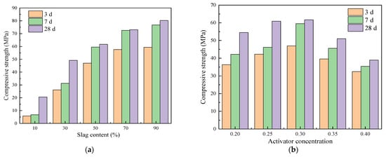(a) The relationship between compressive strength and slag content at different ages; (b) the relationship between compressive strength and the activator concentration at different ages.