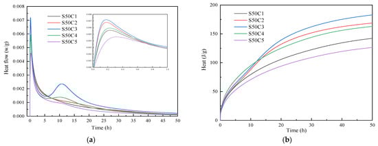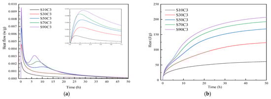 Comparison of the reaction heats of alkali-activated composite cementitious materials under different slag contents: (a) exothermic reaction rate; (b) total heat release.