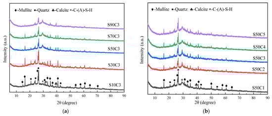 Figure 5a shows the XRD diagram of alkali-activated composite cementitious material under different slag levels. When the slag content is 10%, there is a large amount of quartz and mullite in the cementitious material. This is due to the small Ca2+ content in the system; the hydration reaction is slow, and the hydration products are mainly N-A-S-H gels and quartz, and mullite crystal phases that are not involved in the reaction. When the slag content increases to 30%, at 2θ = 29°, C-(A)-S-H diffuse steamed-bun-like broad peaks begin to appear. Ishwarya et al. [] found that the mineralogical composition of the alkali-activated composite system showed a wide, diffuse peak, which moved to the right in the range of 2θ = 16–39°, indicating the formation of C-S-H gel, and the area of these ridges increased with the increase of slag content in the slurry. This is consistent with our experimental phenomenon. As the slag content continues to increase, the strength of the C-(A)-S-H crystal phase peak increases, the quartz and mullite crystal phase peaks weaken, and there is also trace calcite formation. This is because, with the increase in slag content, more Ca2+ is introduced into the system, and the hydration reaction is accelerated. Additionally, more C-(A)-S-H gels are generated, thereby improving the strength of the cementitious material, and more Ca2+ reacts with CO2 in the air to form calcite.