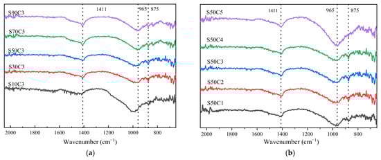 The effects of different combination ratios on the content of C-(A)-S-H gel in alkali-activated cementitious material were analyzed by XRD. However, N-A-S-H is an amorphous phase, which is difficult to be detected by XRD. Certain functional groups in N-A-S-H gel and C-(A)-S-H gel vibrate when exposed to continuously varying infrared light, corresponding to wave peaks in the FT-IR spectrum. Different types of functional groups can be distinguished according to the wave number corresponding to the wave crest. Therefore, N-A-S-H and C-(A)-S-H gels can be detected by FT-IR. The FT-IR spectra of alkali-activated fly ash–slag composite cementitious material at seven days of age at different mixing ratios are shown in Figure 6. The band at 875 cm−1 represents the vibration of the C-O-C bond in the carbonate []. The absorption band around 1411 cm−1 represents the stretching vibration of C-O bond in CO32− ion []. The band around 965 cm−1 is generated by the asymmetric telescopic vibration of the Si-O-T (T stands for Si or Al) dissolved by the [SiO4] tetrahedron and N-A-S-H gel, corresponding to the formation of C-(A)-S-H gels in the hydrated products [].