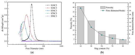 Results of the MIP analysis of alkali-activated composite cementitious materials under different slag contents: (a) pore size distribution; (b) porosity and the pore diameter (mode).