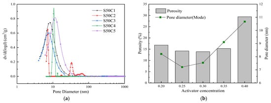 Results of MIP of alkali-activated composite cementitious materials under different activator concentrations: (a) pore size distribution; (b) porosity and the pore diameter (mode).