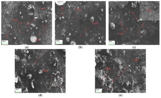 SEM images of alkali-activated composite cementitious materials under different activator concentrations: (a) S50C1; (b) S50C2; (c) S50C3; (d) S50C4; (e) S50C5. (μm* represents the unit μm).