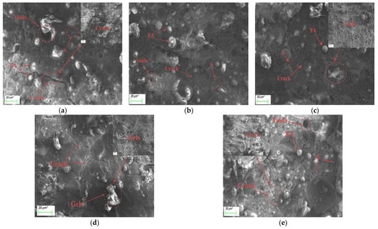 It can be seen from Figure 10 that, when the activator concentration is 0.20, many unreacted fly ash particles, voids and wide cracks can be observed in the image. This is because the low alkaline environment provided is not conducive to the dissolution of minerals such as CaO, Al2O3, SiO2 in the alkali-activated materials, as it inhibits the hydration reaction and reduces the production of hydration products. As a result, the structure is loose and easy to produce cracks, and the porosity of the structure is large, which verifies the results of the pore structure test. When the activator concentration increases to 0.30, only a small number of unreacted fly ash particles were found in the image, the structure was relatively dense, and no obvious cracks are found. This is because, with the increase in the activator concentration, more Na2O and SiO2 are introduced into the system. This improves the alkaline environment of the material, makes the raw material particles dissolve more fully, accelerates the hydration rate, and generates more gels to fill the porous system. The above phenomenon is consistent with the results of the pore structure test. Appropriately increasing the activator concentration can effectively reduce the porosity of the structure, make the structure more compact and uniform, and significantly improve the strength []. When the activator concentration continues to increase to 0.40, there are unreacted fly ash and slag particles, cracks, and holes in the composite architecture, resulting in a decrease in strength. This is because the excessive activator concentration makes the early hydration reaction occur too quickly. The resulting film of hydration products envelops the undissolved silicon–aluminum phase, slowing down the subsequent hydration reaction and resulting in reduced strength [].