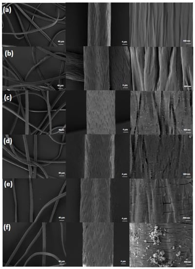 SEM was used to characterize the surface appearance of the functionalized fiber, and the results are presented in Figure 2. Under low magnification (200 times), all of the samples were continuous and showed a complete fiber shape, indicating that the integrity of the fiber was well maintained and had not been damaged (Figure 2, trace a–f). In the SEM images under 2000 times magnification, the surface morphology of PANF was completely flat, and the diameters of PANAF and PANAF-FeOOH were significantly increased due to swelling in the chemical grafting reaction [35]. When the SEM images were enlarged 20,000 times, several fissures appeared on the fiber that increased the contact area between the fiber and the substrate, which was more conducive to catalysis and adsorption [33]. In addition, in the process of PANAF-FeOOH synthesis, an even distribution of iron oxides could be seen on the surface of the fiber when the colloidal concentration of Fe(OH)3 was lower than 0.3 mol L−; however, when the concentration of Fe(OH)3 colloid was adjusted to 0.5 mol L−1, the iron oxide particles became larger and the uniformity was reduced.