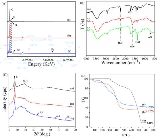 (A) The EDS spectra of (a) PANF, (b) PANAF, and (c) PANAF-FeOOH; (B) The FTIR spectra of (a) PANF, (b) PANAF, and (c) PANAF-FeOOH; (C) The XRD patterns and (D) TGA spectra of (a) PANF, (b) PANAF, and (c) PANAF-FeOOH.