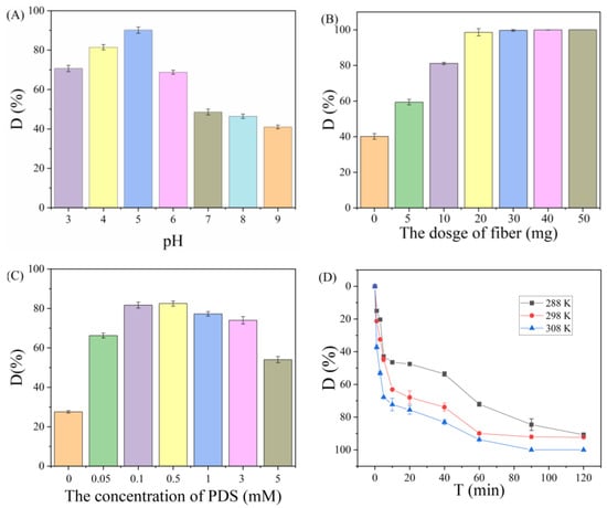 Influence of (A) pH, (B) fiber dosage, (C) PDS concentration, and (D) reaction time on PPOA degradation.
