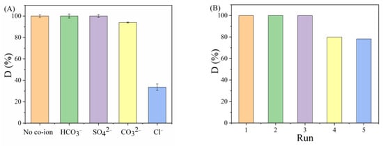 (A) The impact of coexisting ions on PPOA degradation; (B) renewability of PANAF-FeOOH for PPOA degradation.
