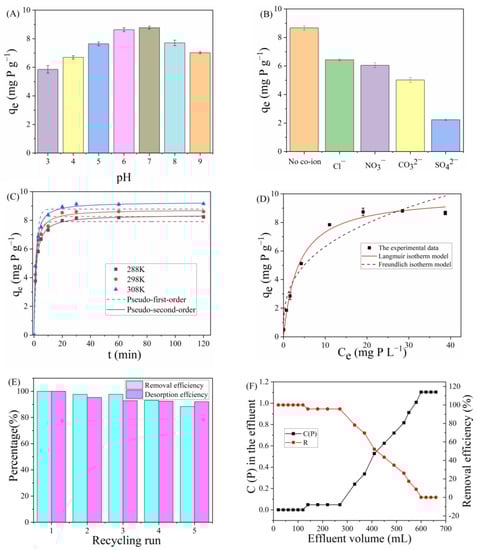 where C0, Ce, and Ct (mg P L−1) represent the initial concentration of phosphate, the equilibrium concentration of phosphate, and the phosphate concentration at a certain time, respectively. V (mL) is the solution volume and m (g) is the fiber mass.