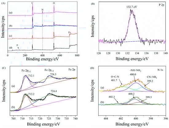 (A) XPS survey of (a) PANF, (b) PANAF, (c) PANAF-FeOOH, and (d) PANAF-FeOOH-P; (B) High-resolution spectrum of P 2p for PANAF-FeOOH-P; (C) High-resolution Fe 2p spectrum of (a) PANAF-FeOOH and (b) PANAF-FeOOH-P; (D) High-resolution N 1s spectrum of (a) PANAF-FeOOH and (b) PANAF-FeOOH-P.