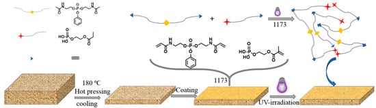 The FNFs were cut to a certain size and pressed under a plate vulcanizing machine at 180 °C and 8 KPa, preheated for 8 min, held for 8 min, removed, and cooled for 10 min, to form the fiber composite plates. The precursor solution was prepared using a simple solution mixing method. The formulations are listed in Table 1. First, PDHAA and PM-2 were mixed with different mass ratios in a beaker under continuous stirring. Next, 4wt% Darocur 1173 as a photoinitiator was added to the above mixture. The whole system was stirred using a glass rod at room temperature for about 20 min. The mixture was then put in a vacuum drying oven for about 30 min at 25 °C, to remove bubbles. Finally, the uniform and yellowish precursor solution was coated on the fiber composite plate with a rod coater, and the coating thickness was 200 μm. It was then exposed to a UV-curing machine with a power of 1 KW and a wavelength of 320–400 nm; the fabrication procedure is displayed in Figure 1.