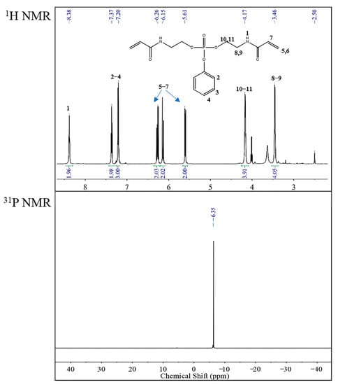 PDHAA was synthesized through the reaction between Phenyl dichlorophosphate (PDCP) and N-hydroxyethyl acrylamide (HEAA), and the structure of PDHAA was characterized using FTIR, 1H NMR, and 31P NMR. Figure 2 shows the FTIR spectrum of PDCP, HEAA, and PDHAA; the peaks at 1668 cm−1, 1627 cm−1, and 1315 cm−1 were ascribed to C=O, C=C, and C-N stretching of the HEAA structure units, respectively [,]. The peaks at 1168 cm−1, 1026 cm−1, and 761 cm−1 corresponded to P=O and P-O-C stretching of the PDCP structure units, respectively []. All of the above peaks also existed in the spectrum of the PDHAA. In the FTIR spectrum of the PDCP, the peak at 560 cm−1 belonged to the characteristic absorption of phosphorus chloride bond, while there were no homologous absorption peaks in the PDHAA spectrum []. The resulting P-O-C peak overlapped with the PDCP structure units, indicating that PDHAA was successfully synthesized through the reaction between PDCP and HEAA.