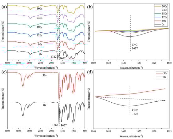 In order to study the UV curing behavior of flame-retardant coatings, the coatings of the FNFs-1 and FNFs-5 samples were selected for real-time FTIR characterization, to study the curing behavior of PM-2 and PDHAA; then C=O was used an as an internal standard peak to calculate the double bond conversion rate of the coating using the area of C=C double bond and C=O peak. As shown in Figure 4a,b, for PM-2 with a single functional group, the peaks at 1637 cm−1 and 1722 cm−1 corresponded to the C=C and C=O absorption peaks. After 300 s UV irradiation, the C=C absorption peak of the coating decreased; and at this time, the double bond conversion reached 93.4%. As shown in Figure 4c,d, the C=C absorption peak at 1627 cm−1 disappeared after 30 s UV irradiation, and the coating had a faster curing rate and double bond conversion rate. This was due to the high double bond density of PDHAA, which increased the initial reaction rate of the coating [].