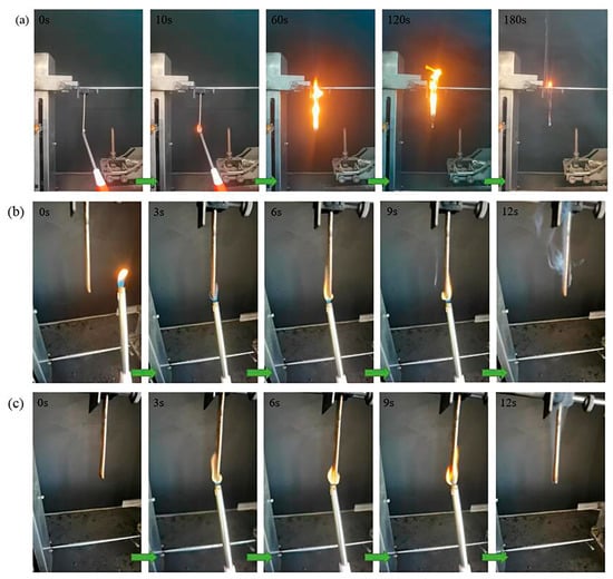 (a) Vertical combustion behavior of FNFs, (b,c) vertical combustion behavior of FNFs-4 ignited twice.