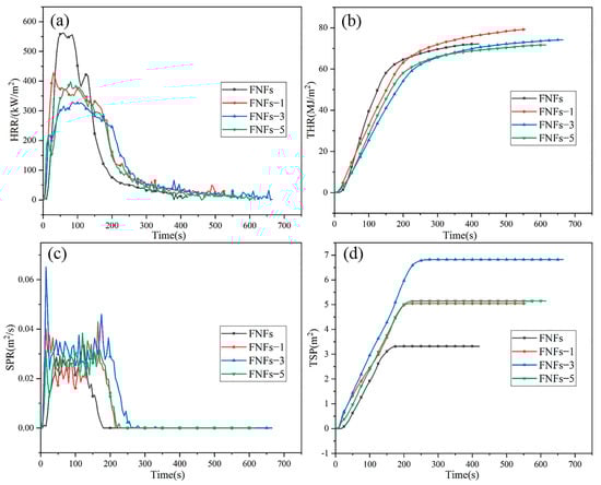 Cone calorimetry was used to evaluate the combustion behavior of the composites and to predict the fire intensity in a real fire []. The combustion behavior of the FNFs, FNFs -1, FNFs-3, and FNFs -5 was studied using cone calorimetry. The thermal parameters and smoke parameters of these samples are shown in Table 2, and the curves of selected data are shown in Figure 6. In Figure 6a, due to the loose fiber structure of the FNFs, the PHRR of FNFs reached 568.35 kW/m2 at 48 s and Av-HRR reached 211.76 kW/m2 at 11–346 s after ignition. Differently from the FNFs, the PHRR and Av-HRR of the coated FNFs were reduced, and the combustion was delayed. The coated FNFS formed a dense carbon layer on the surface after ignition, which insulated the heat source and extended the combustion time. Figure 6b shows the THR of the FNFs. The THR of the FNFs was 72.3 MJ/m2, while the THR value of the FNFs-5 sample dropped to 71.8 MJ/m2, which was lower than the other samples.